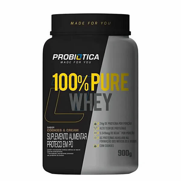 100% Pure Whey 900g Probiótica é um suplemento alimentar proteico composto por Whey Protein Concentrate, a proteína concentrada do soro do leite. Sua matéria prima é elaborada com tecnologia de ponta e além disso, contém elevada concentração de aminoácidos essenciais (aminoácidos que não são produzidos por nosso corpo) e alta quantidade de aminoácidos de cadeia ramificada (BCAA).